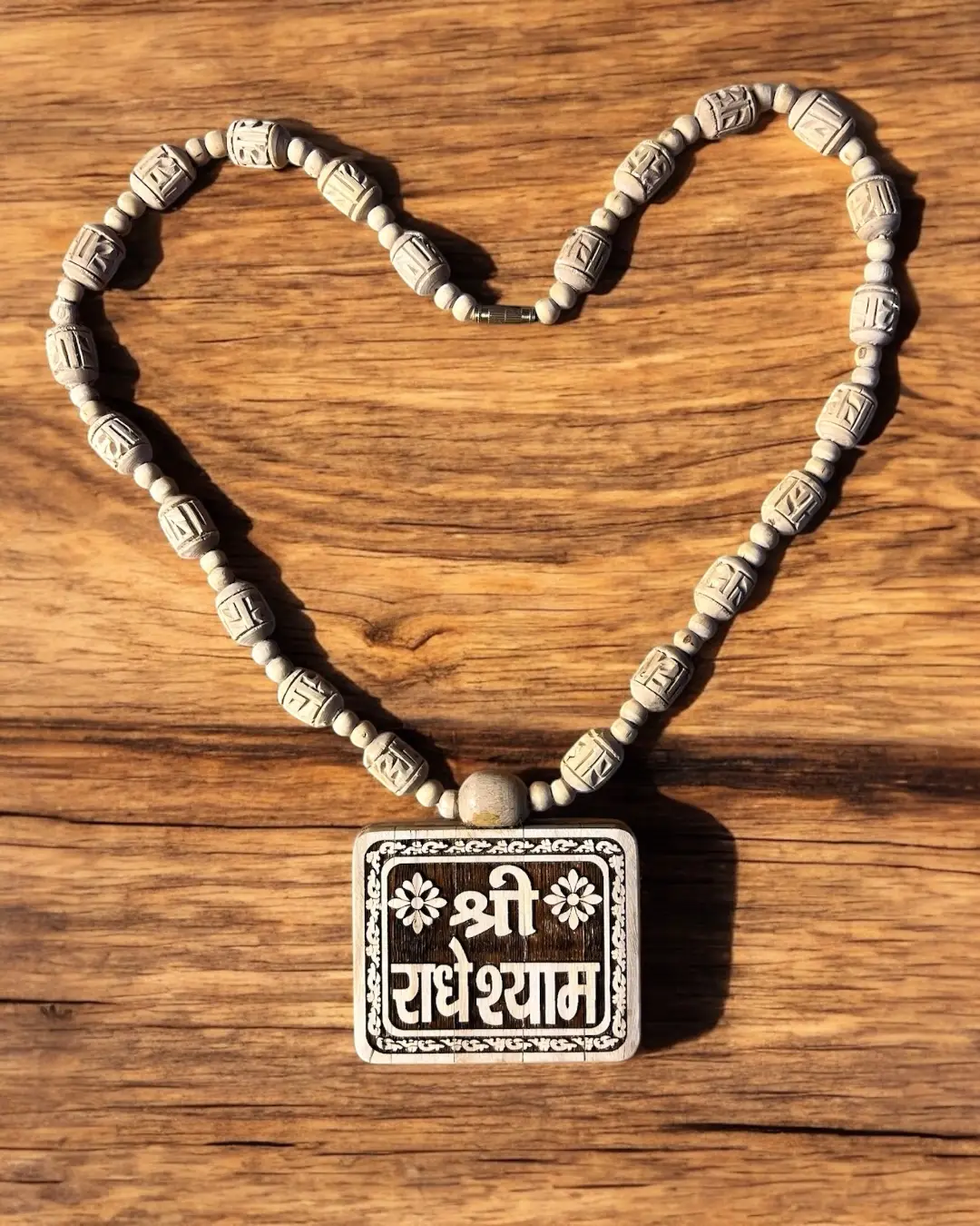 Crafted from premium-quality natural wood, the mala is lightweight, durable, and comfortable for daily wear. Each bead is finely carved, showcasing traditional craftsmanship. The square wooden pendant engraved with “Shri Radhe Shyam” symbolizes eternal love, devotion, and inner harmony.