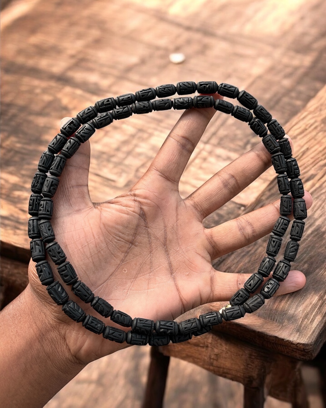 This premium black beaded mala is crafted with finely carved cylindrical beads, giving it a refined and elegant appearance. The beads are smoothly finished and strung on a strong, durable thread, making the mala lightweight, comfortable, and suitable for long-term daily wear. Its unisex design makes it ideal for both men and women.