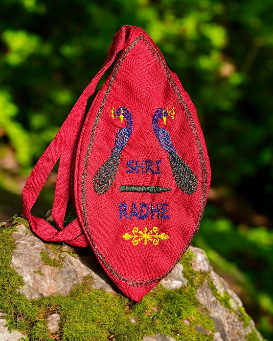 This beautifully crafted jaap bag features “Shri Radhe” embroidery along with peacock motifs, symbolizing divine love and devotion to Radha–Krishna. The yellow color represents purity, positivity, and spiritual energy, helping create a peaceful mindset during meditation and chanting.